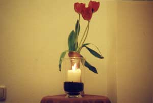 Blumen und Todeskerzeim Hospiz vor Katjas Zimmer am Tag ihres Sterbens
