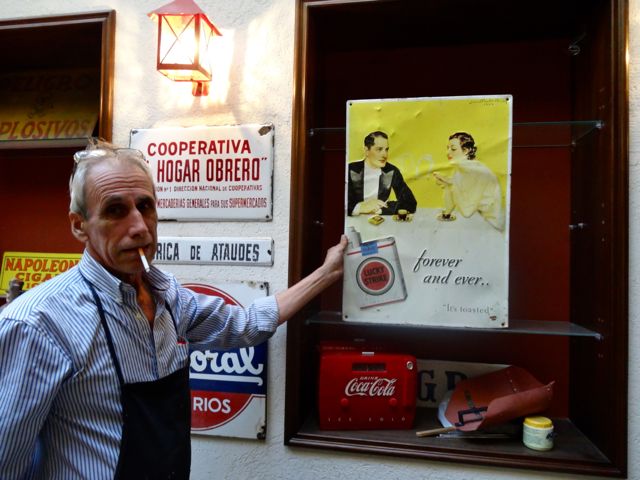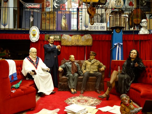 Dann rufen sie einen Kollegen, der mir alles zeigen soll. Pablo – „como Picasso“ führt mich in einen atemberaubenden Raum, ca 150 Quadratmeter groß, voll, übervoll mit den unglaublichsten Fundstücken und Sammlungen aus vergangenen Jahren. Ich verstehe nicht alles, was er sagt, nur so viel: Das ist ein super privater Ort, in dem private Feste und Veranstaltungen gefeiert werden – mit stark politischer Intention. Also, das Café „Las parablas“. (Café „Die Worte“) Hier aber erst ohne Worte.
