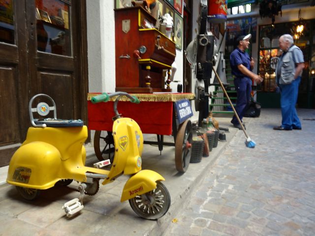 Villa Crespo. Eine halboffene Tür. Ich spähe hinein, sehe in der Einfahrt zwischen lauter alten Spielsachen und Geräten zwei Typen, die an irgendetwas herumbosseln. Denke: ein Antiquariat, mal sehen. Und werde streng aufgehalten: